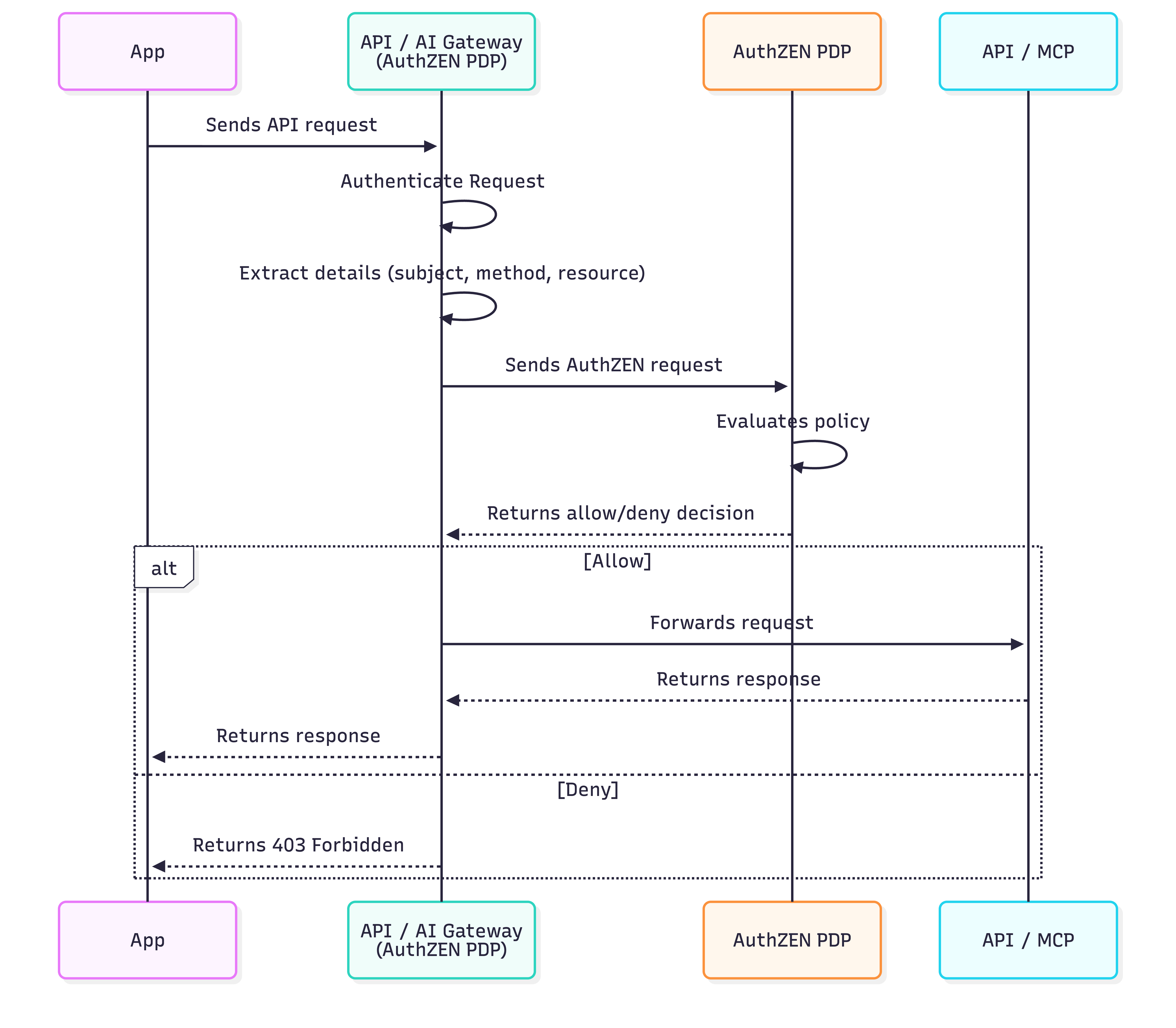 By acting as an AuthZEN-compliant Policy Enforcement Point (PEP), the gateway evaluates authorization decisions consistently across APIs, AI services, MCP apps & servers. It integrates seamlessly with AuthZEN-compliant Policy Decision Points (PDPs).