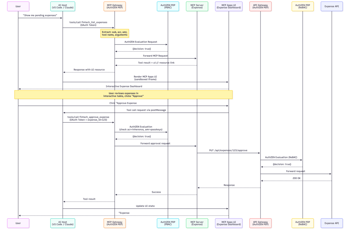 Placed in front of the MCP server, the MCP Gateway enforces real-time authorization for MCP tool calls and UI interactions via an external PBAC system. In this example, only analysts authenticated with a phishing-resistant authenticator can view and approve expenses, while unauthorized actions such as deletions are blocked.